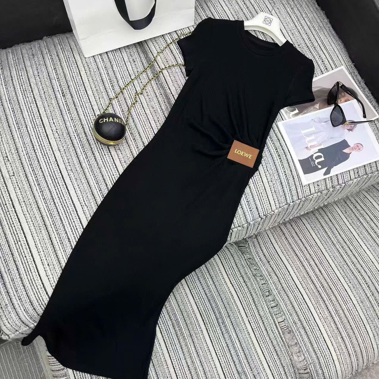 Đầm Thun Dài Đen Dính Da Nâu Chữ Loe