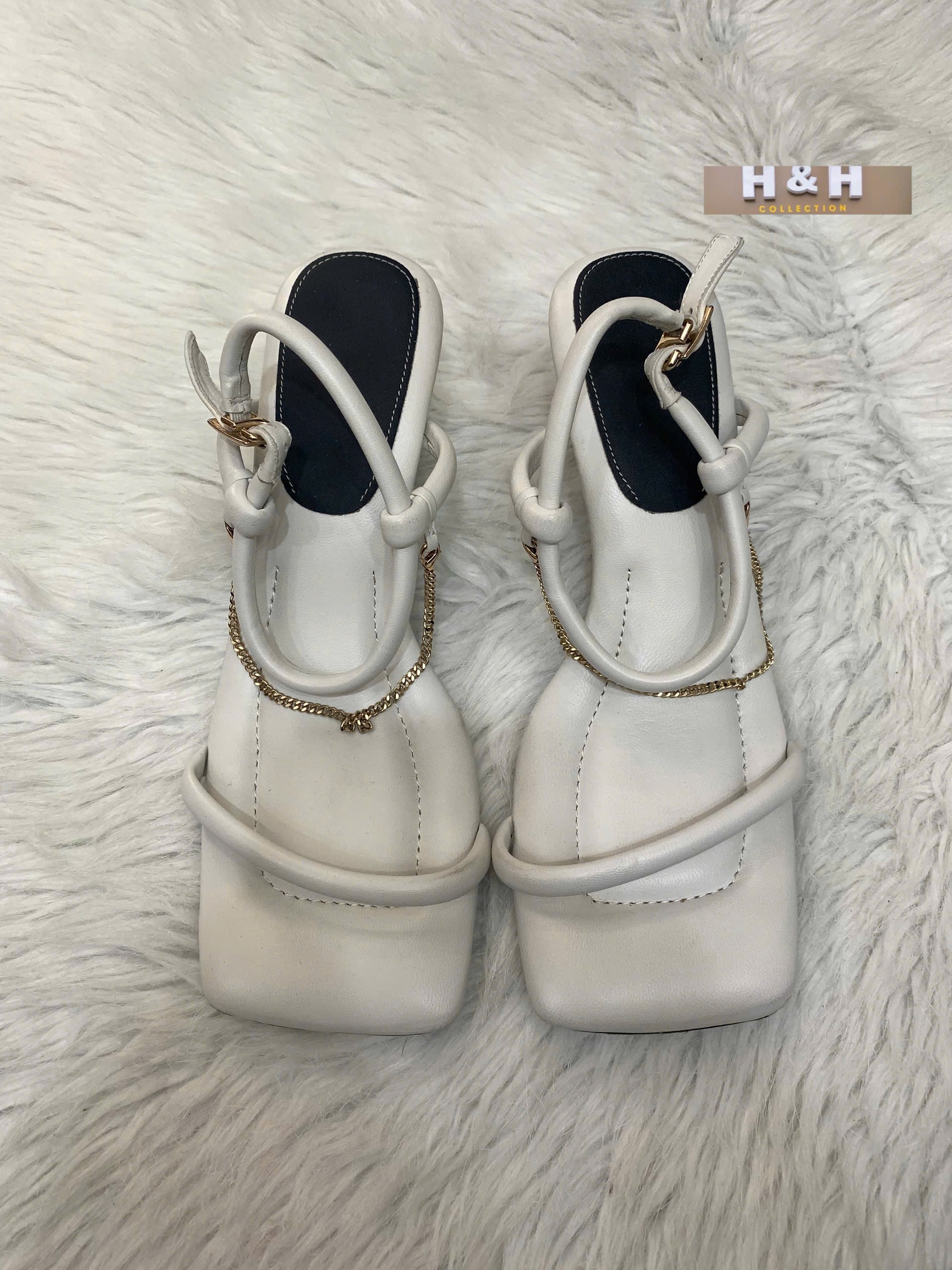 Giày Sandan Cao Gót Đính Dây Xích Trắng