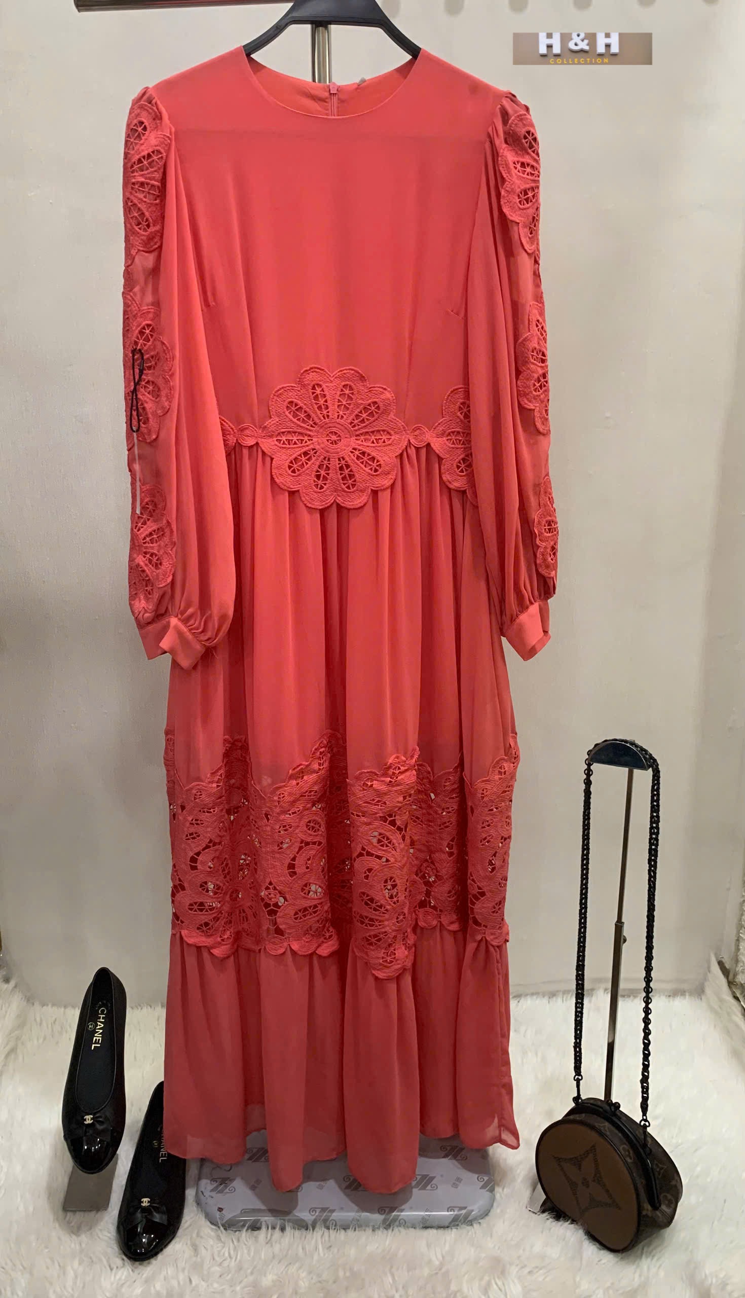 Đầm Maxi Hồng Tay Dài Phối Ren
