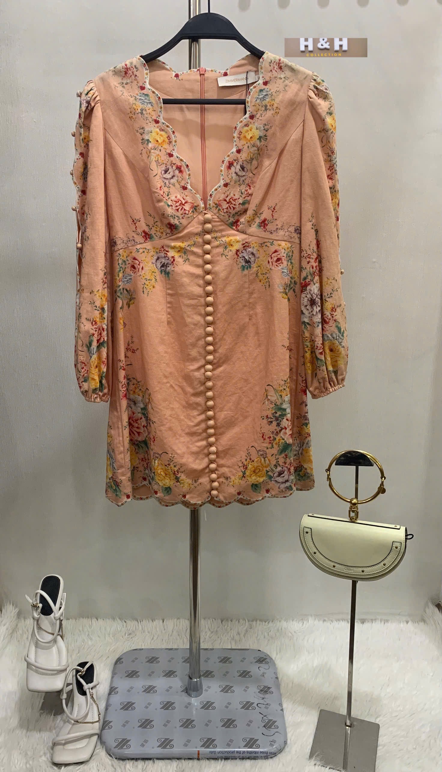 Đầm Viền Hoa Gài Nút Tay Dài Cam