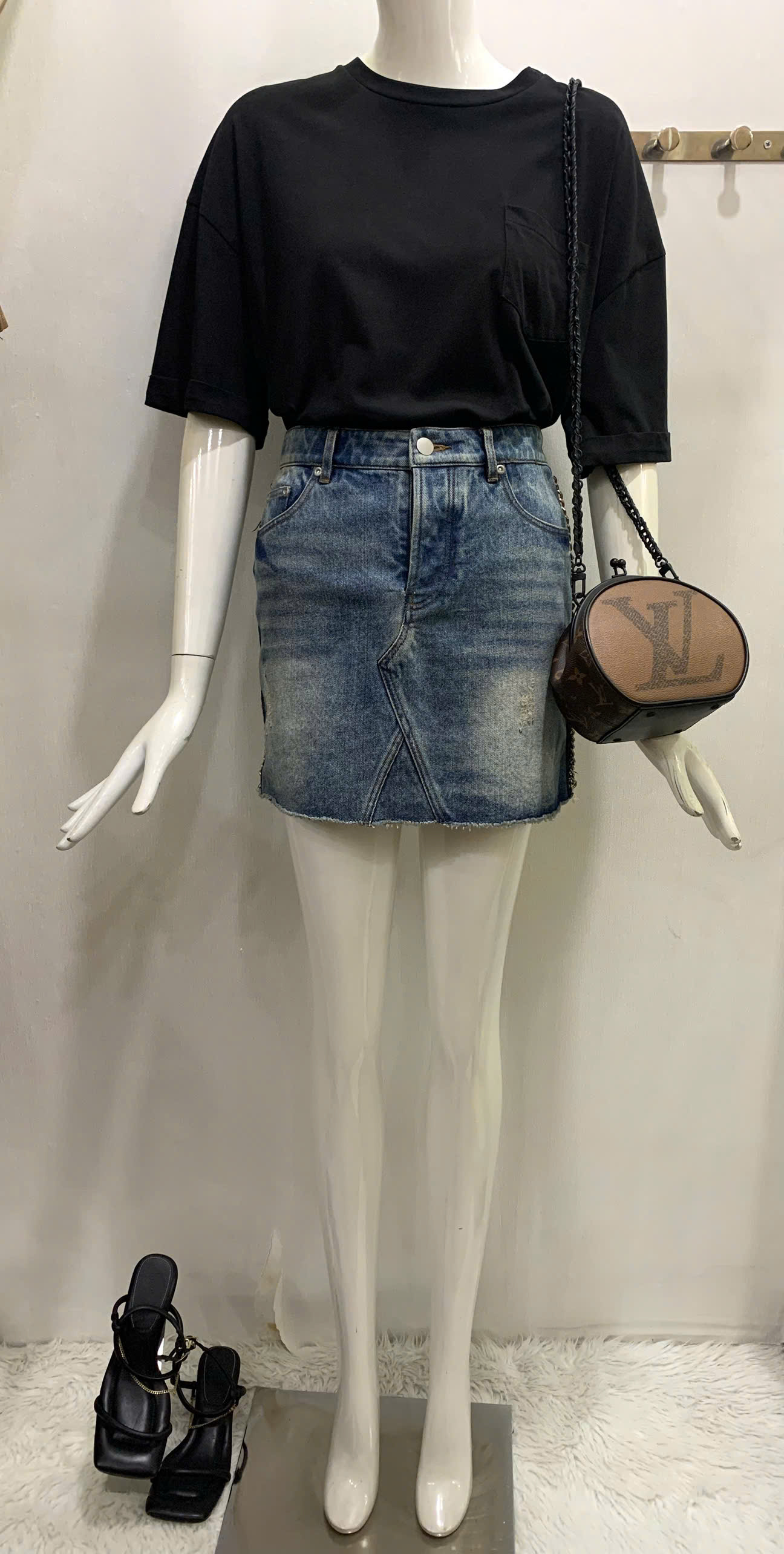 SET VÁY JEANS DÂY XÍCH + ÁO THUN ĐEN MỘT TÚI